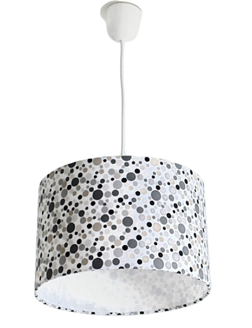 La suspension abat-jour est réalisée à partir d'une carcasse métallique finition époxy blanche recouverte de tissu 100% coton certifié OEKO TEX (sans produit chimique) motifs imprimés pois contrecollé sur un polyphane ignifugé blanc (PVC non inflammable).