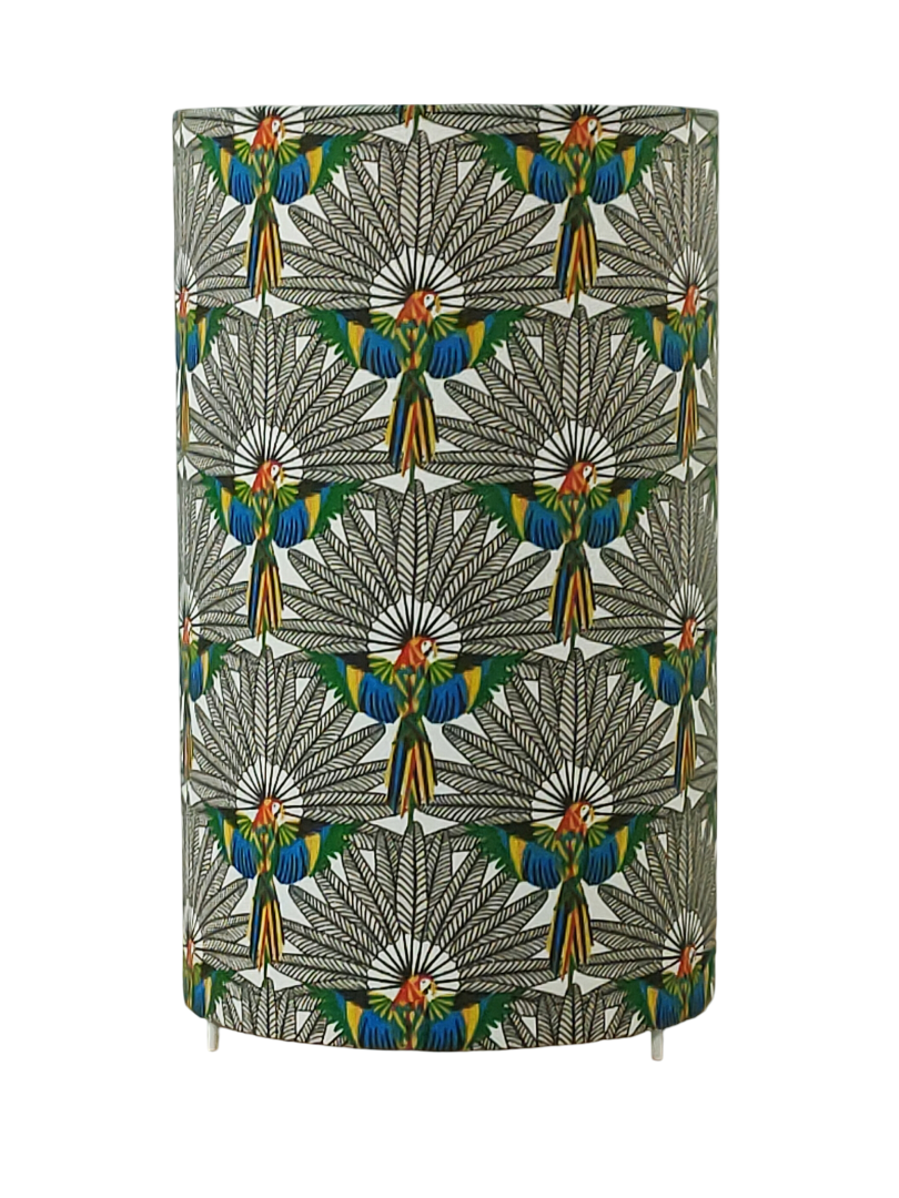 La lampe tube est réalisée à partir d'une carcasse métallique avec pieds finition époxy blanche recouverte de tissu 100% coton certifié OEKO TEX (sans produit chimique) motifs imprimés perroquets contrecollé sur un polyphane ignifugé blanc (PVC non inflammable).