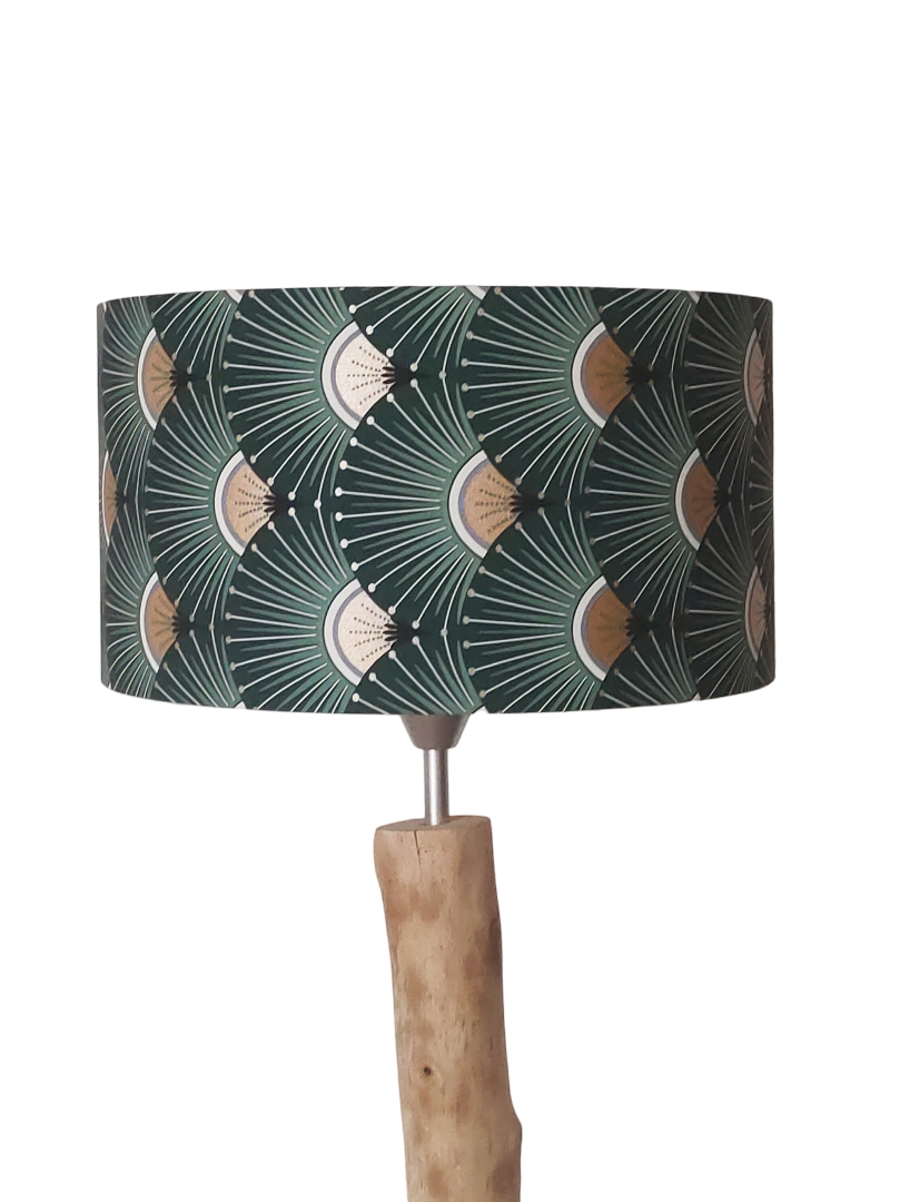 L’abat-jour est réalisé à partir d'une carcasse métallique finition époxy blanche recouverte de papier intissé imprimé motifs art déco vert et or contrecollé sur un polyphane ignifugé blanc (PVC non inflammable).