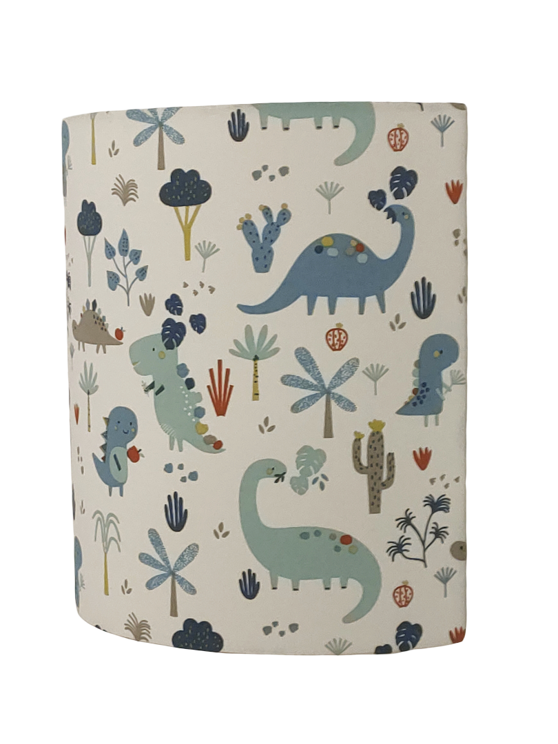 Les Appliques Murales sont réalisées à partir d'une carcasse métallique demi-cylindrique finition peinture époxy blanche recouverte de tissu 100% coton certifié OEKO TEX (sans produit chimique) motifs imprimés Dinosaures contrecollé sur un polyphane ignifugé blanc (PVC non inflammable).