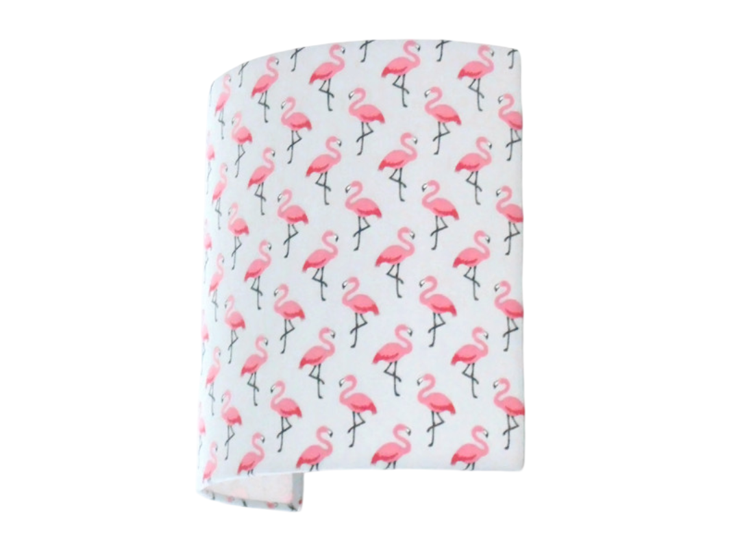 Les Appliques Murales sont réalisées à partir d'une carcasse métallique demi-cylindrique finition peinture époxy blanche recouverte de tissu 100% coton certifié OEKO TEX (sans produit chimique) motifs imprimés flamant rose contrecollé sur un polyphane ignifugé blanc (PVC non inflammable).