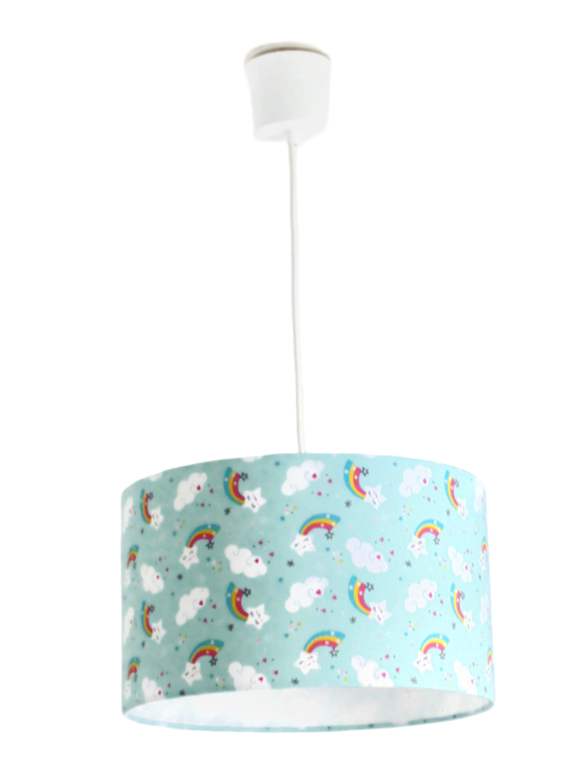 La suspension abat-jour est réalisée à partir d'une carcasse métallique finition époxy blanche recouverte de tissu 100% coton certifié OEKO TEX (sans produit chimique) motifs imprimés nuages, étoiles filantes et arc en ciel sur fond turquoise contrecollé sur un polyphane ignifugé blanc (PVC non inflammable).