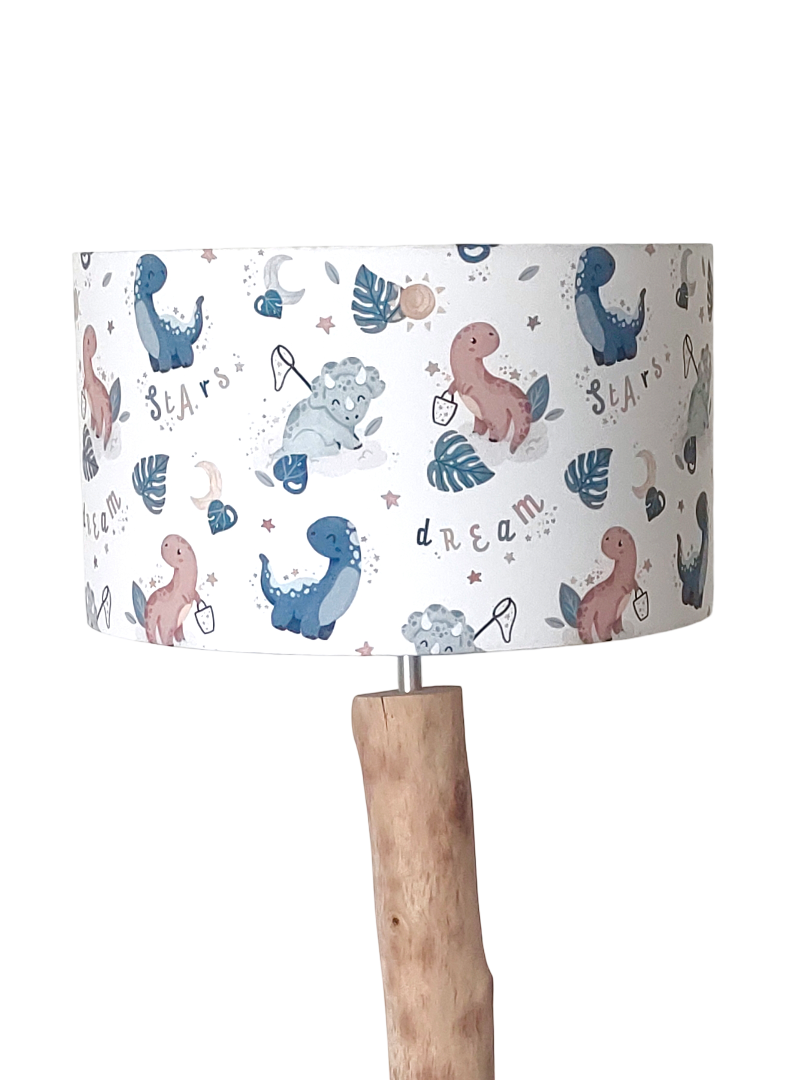 L’abat-jour est réalisé à partir d'une carcasse métallique finition époxy blanche recouverte de tissu 100% coton certifié OEKO TEX (sans produit chimique) motifs imprimés dinosaures contrecollé sur un polyphane ignifugé blanc (PVC non inflammable).