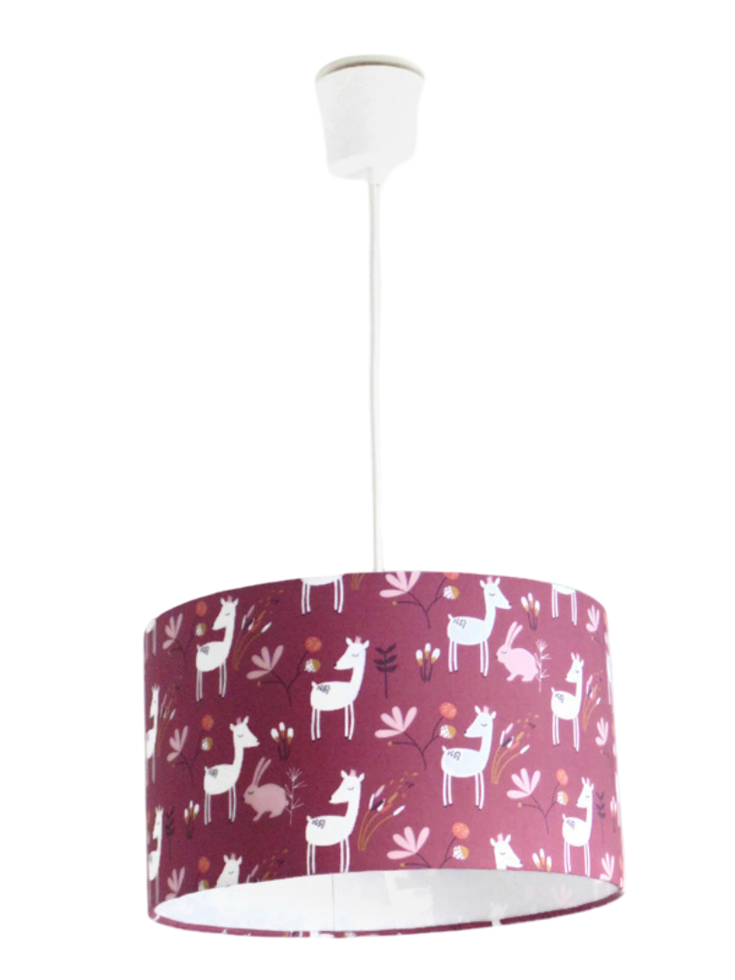 La suspension abat-jour est réalisée à partir d'une carcasse métallique finition époxy blanche recouverte de tissu 100% coton certifié OEKO TEX (sans produit chimique) motifs imprimés faons et lapins sur fond violet contrecollé sur un polyphane ignifugé blanc (PVC non inflammable).