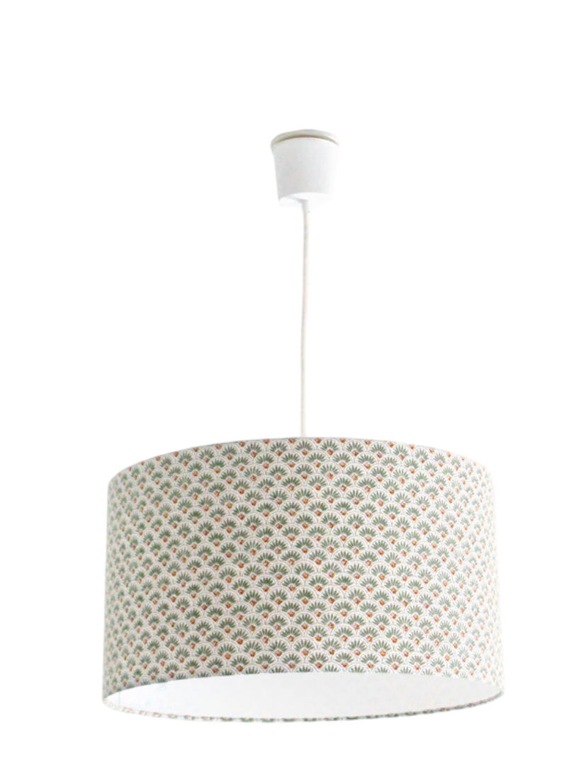 La suspension abat-jour est réalisée à partir d'une carcasse métallique finition époxy blanche recouverte de tissu 100% coton certifié OEKO TEX (sans produit chimique) motifs imprimés provençal - éventails contrecollé sur un polyphane ignifugé blanc (PVC non inflammable).