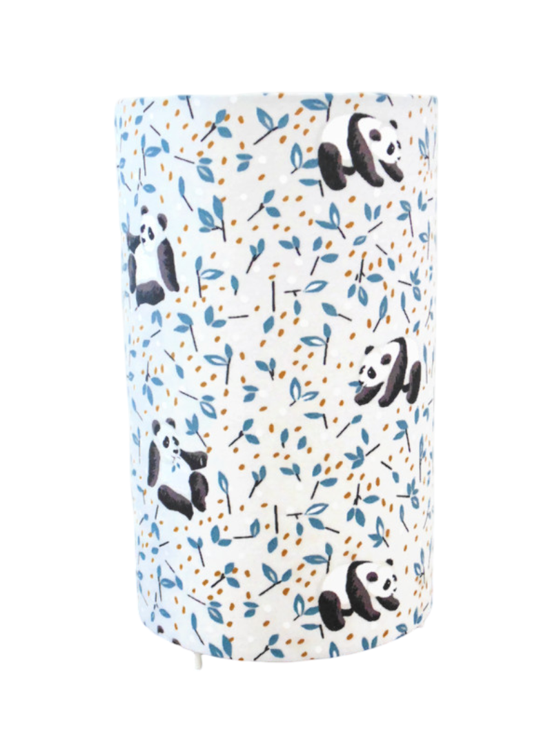 La lampe tube est réalisée à partir d'une carcasse métallique avec pieds finition époxy blanche recouverte de tissu 100% coton certifié OEKO TEX (sans produit chimique) motifs imprimés pandas contrecollé sur un polyphane ignifugé blanc (PVC non inflammable).