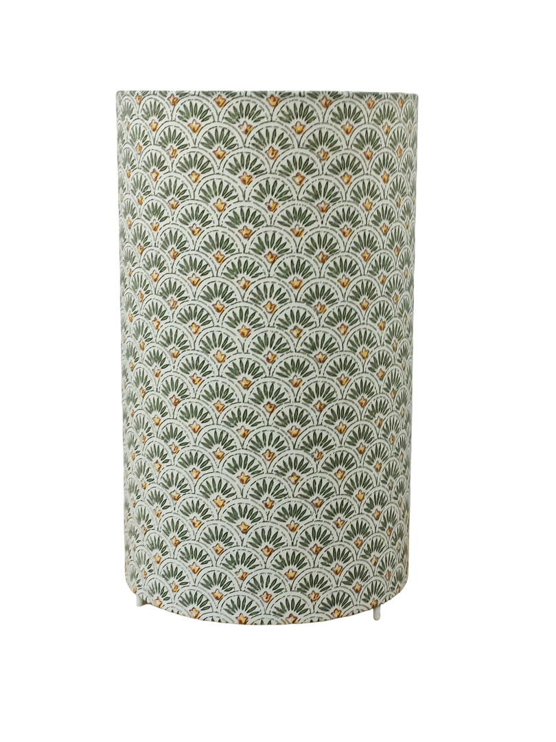 La lampe tube est réalisée à partir d'une carcasse métallique avec pieds finition époxy blanche recouverte de tissu 100% coton certifié OEKO TEX (sans produit chimique) motifs imprimés éventails contrecollé sur un polyphane ignifugé blanc (PVC non inflammable).