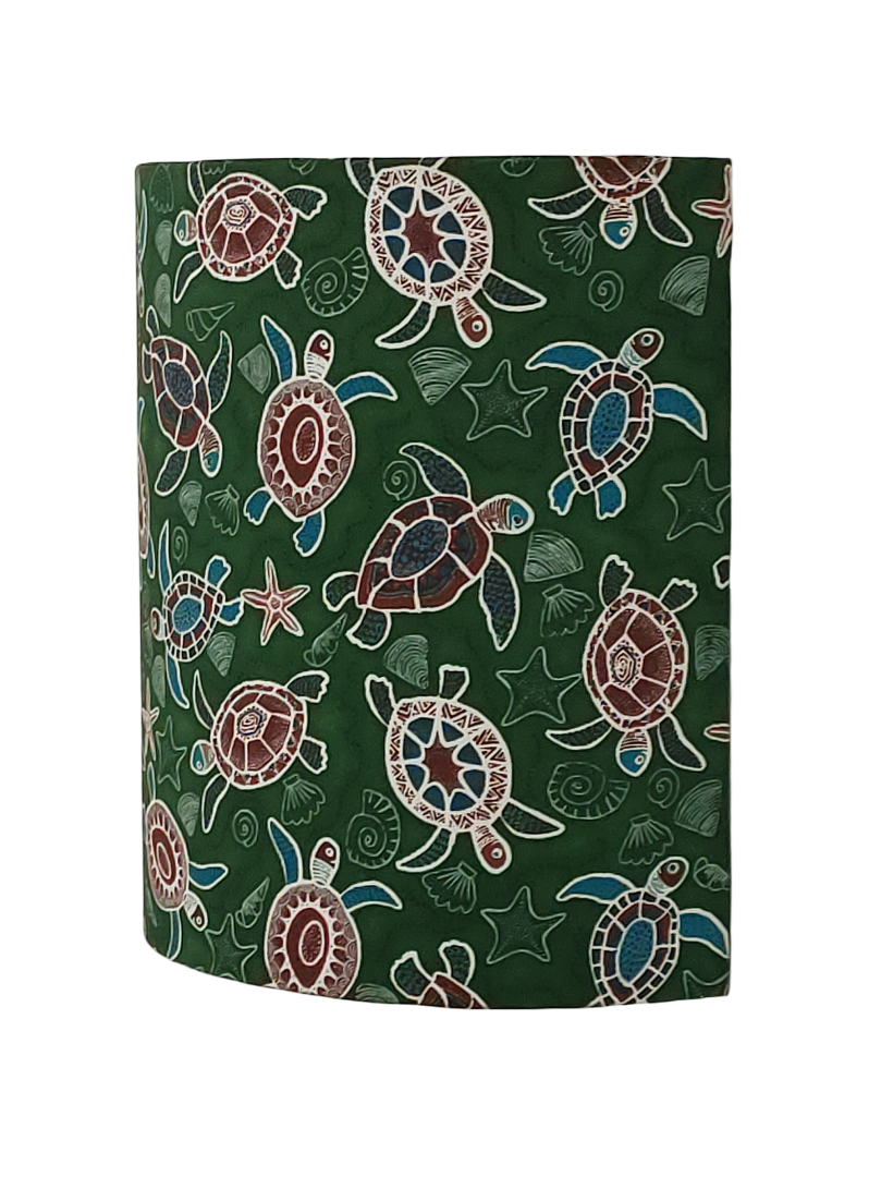 Les Appliques Murales sont réalisées à partir d'une carcasse métallique demi-cylindrique finition peinture époxy blanche recouverte de tissu 100% coton certifié OEKO TEX (sans produit chimique) motifs imprimés tortues de mer contrecollé sur un polyphane ignifugé blanc (PVC non inflammable).