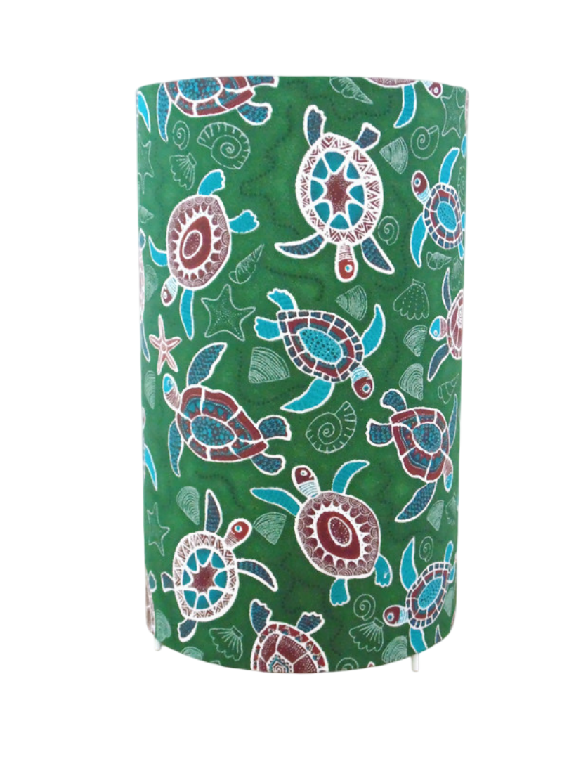 La lampe tube est réalisée à partir d'une carcasse métallique avec pieds finition époxy blanche recouverte de tissu 100% coton certifié OEKO TEX (sans produit chimique) motifs imprimés tortues de mer contrecollé sur un polyphane ignifugé blanc (PVC non inflammable).