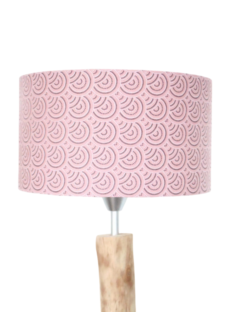 L’abat-jour est réalisé à partir d'une carcasse métallique finition époxy blanche recouverte de tissu 100% coton certifié OEKO TEX (sans produit chimique) motifs imprimés aborigène contrecollé sur un polyphane ignifugé blanc (PVC non inflammable).