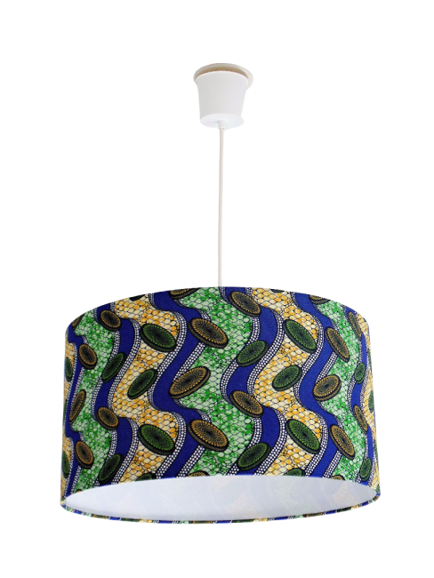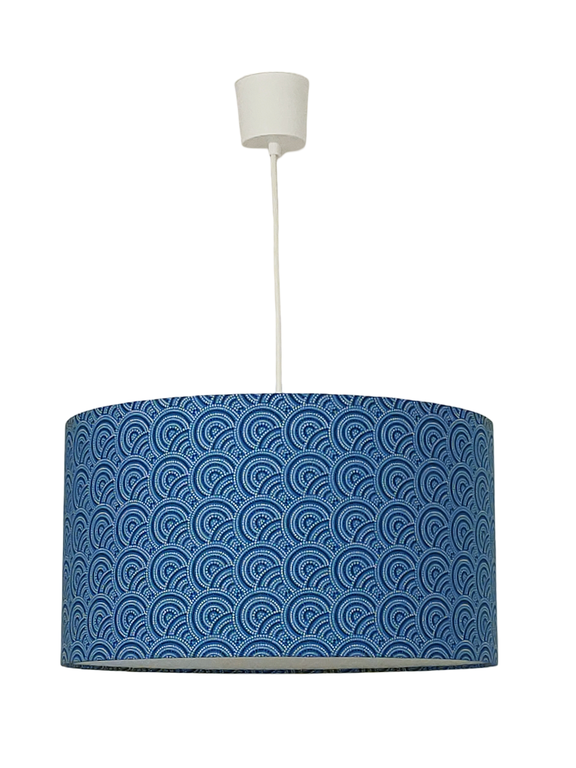 La suspension abat-jour est réalisée à partir d'une carcasse métallique finition époxy blanche recouverte de tissu 100% coton certifié OEKO TEX (sans produit chimique) motifs imprimés aborigènes contrecollé sur un polyphane ignifugé blanc (PVC non inflammable).
