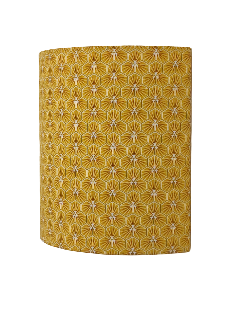 Les Appliques Murales sont réalisées à partir d'une carcasse métallique demi-cylindrique finition peinture époxy blanche recouverte de tissu 100% coton certifié OEKO TEX (sans produit chimique) motifs imprimés géométriques - Riad Jaune Safran contrecollé sur un polyphane ignifugé blanc (PVC non inflammable).