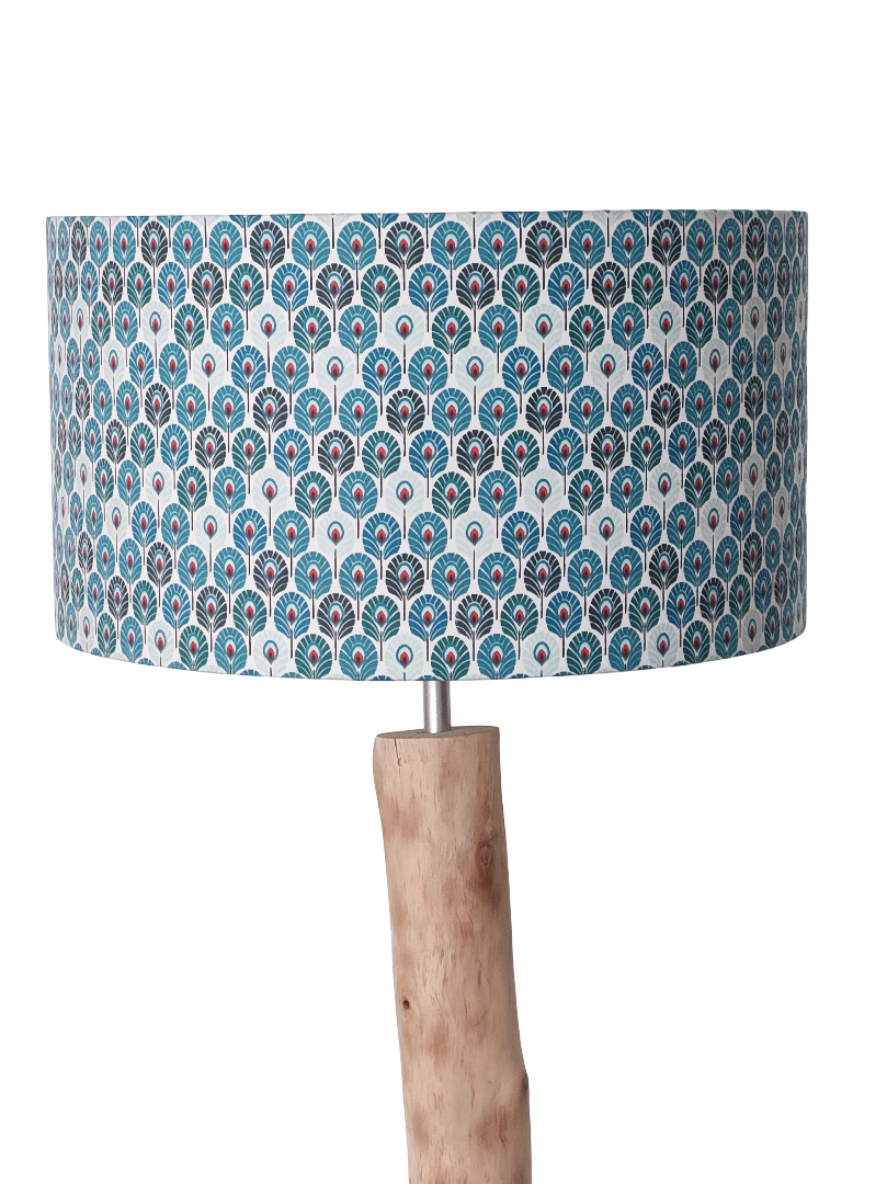 L’abat-jour est réalisé à partir d'une carcasse métallique finition époxy blanche recouverte de tissu 100% coton certifié OEKO TEX (sans produit chimique) motifs imprimés mini plumes de paon bleues contrecollé sur un polyphane ignifugé blanc (PVC non inflammable).