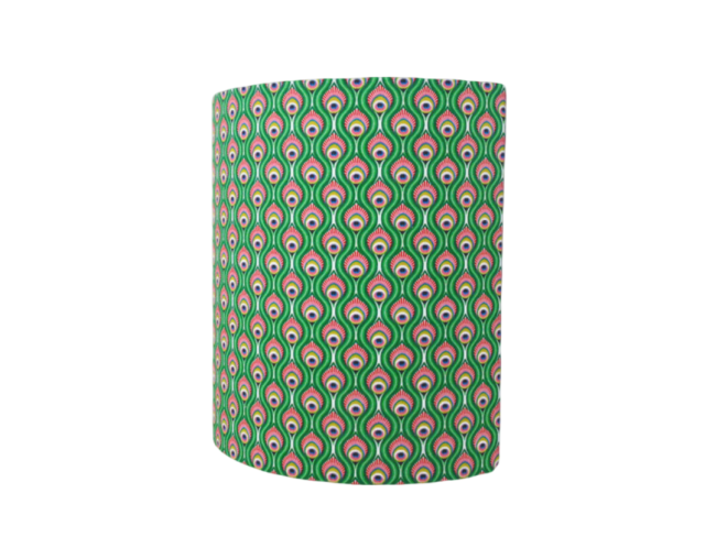 Les Appliques Murales sont réalisées à partir d'une carcasse métallique demi-cylindrique finition peinture époxy blanche recouverte de tissu 100% coton certifié OEKO TEX (sans produit chimique) motifs imprimés mini plumes de paon contrecollé sur un polyphane ignifugé blanc (PVC non inflammable).