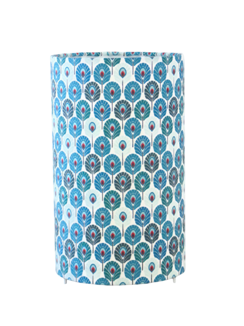 La lampe tube est réalisée à partir d'une carcasse métallique avec pieds finition époxy blanche recouverte de tissu 100% coton certifié OEKO TEX (sans produit chimique) motifs imprimés mini plumes de paon bleues contrecollé sur un polyphane ignifugé blanc (PVC non inflammable).