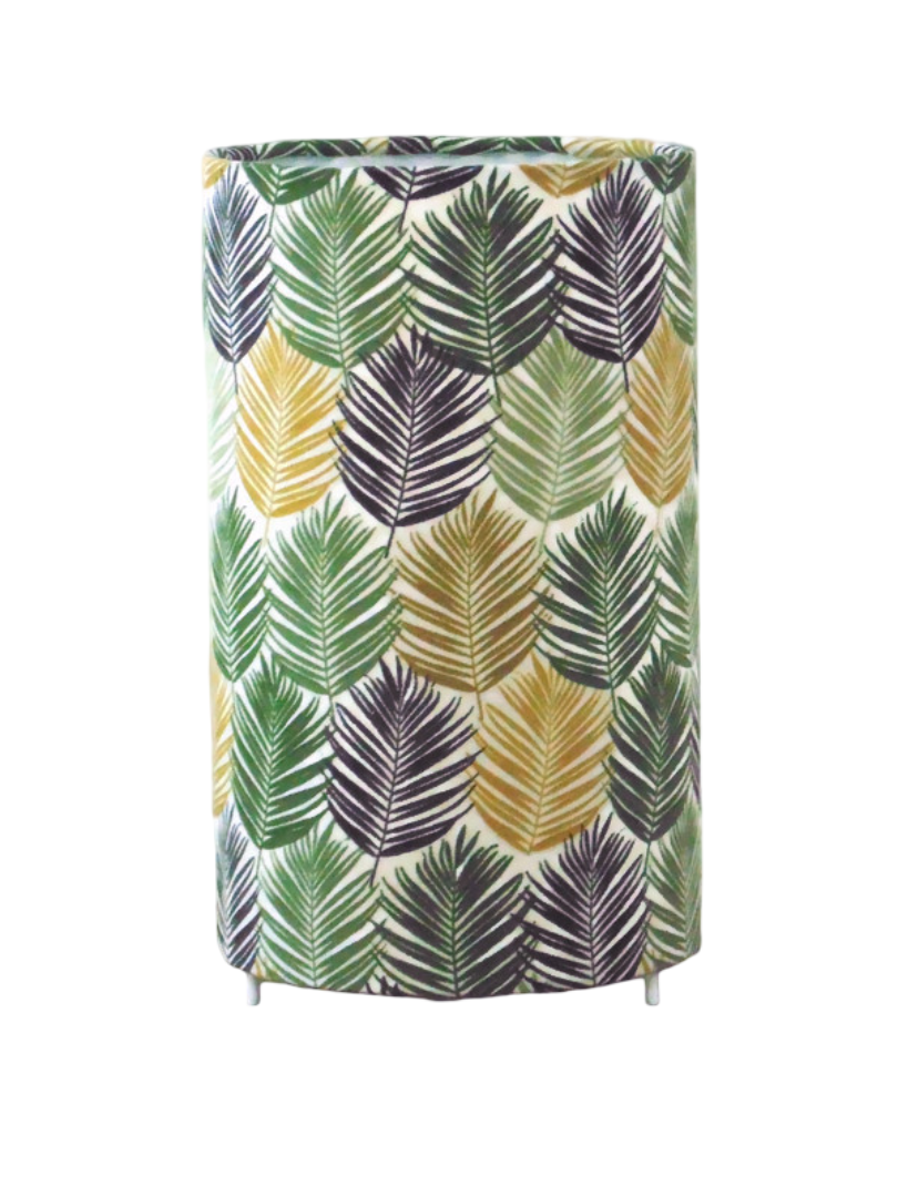 La lampe tube est réalisée à partir d'une carcasse métallique avec pieds finition époxy blanche recouverte de tissu 100% coton certifié OEKO TEX (sans produit chimique) motifs imprimés exotique contrecollé sur un polyphane ignifugé blanc (PVC non inflammable).