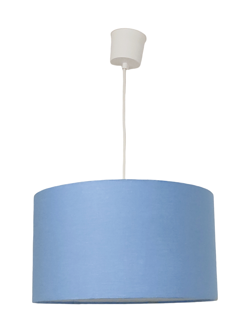 La suspension abat-jour est réalisée à partir d'une carcasse métallique finition époxy blanche recouverte de tissu 100% lin bleu contrecollé sur un polyphane ignifugé blanc (PVC non inflammable).