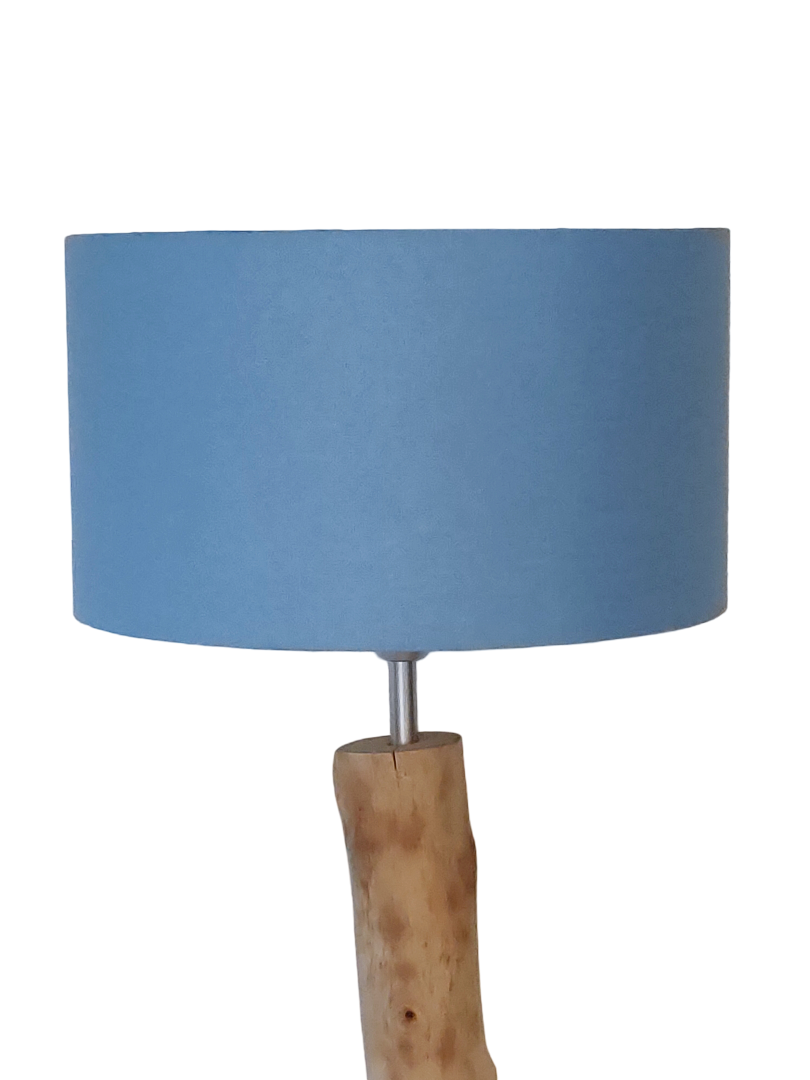 création artisanale, unique et originale d'un abat jour cylindrique en lin bleu entièrement fait main.