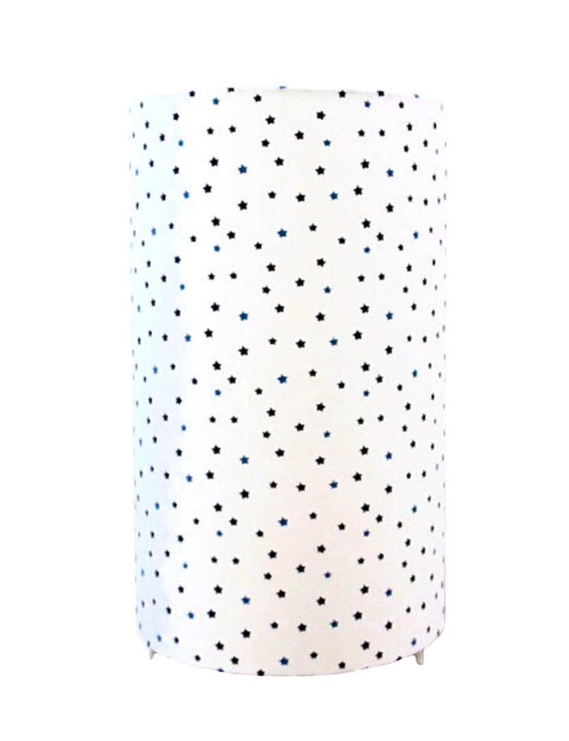 La lampe tube est réalisée à partir d'une carcasse métallique avec pieds finition époxy blanche recouverte de tissu 100% coton certifié OEKO TEX (sans produit chimique) motifs imprimés étoiles bleues contrecollé sur un polyphane ignifugé blanc (PVC non inflammable).