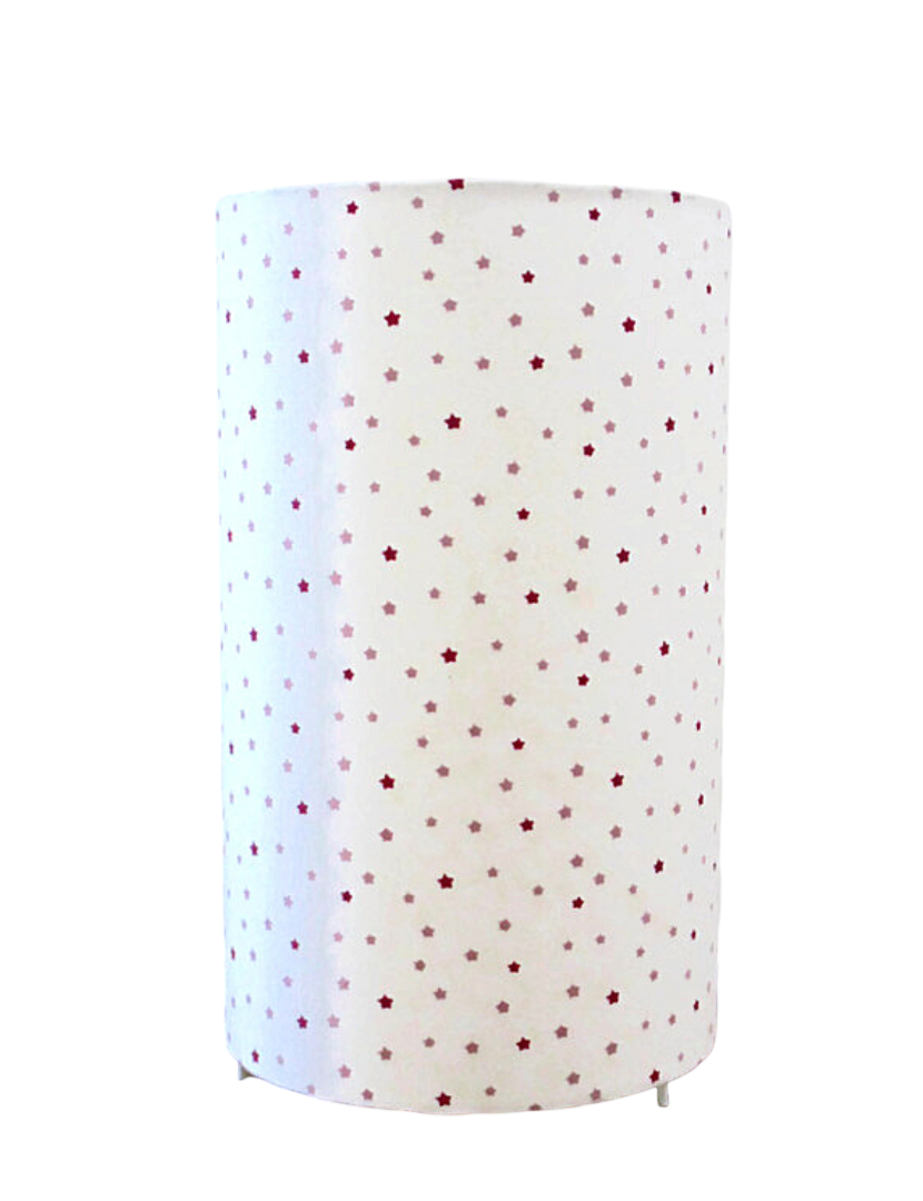 La lampe tube est réalisée à partir d'une carcasse métallique avec pieds finition époxy blanche recouverte de tissu 100% coton certifié OEKO TEX (sans produit chimique) motifs imprimés étoiles roses contrecollé sur un polyphane ignifugé blanc (PVC non inflammable).
