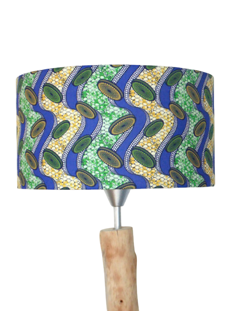 L’abat-jour est réalisé à partir d'une carcasse métallique finition époxy blanche recouverte de tissu 100% coton certifié OEKO TEX (sans produit chimique) motifs imprimés wax contrecollé sur un polyphane ignifugé blanc (PVC non inflammable).