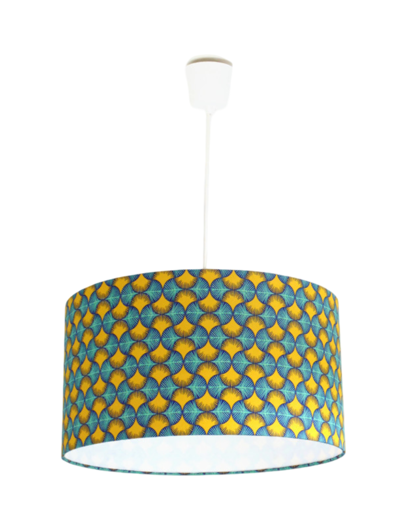 La suspension abat-jour est réalisée à partir d'une carcasse métallique finition époxy blanche recouverte de tissu 100% coton certifié OEKO TEX (sans produit chimique) motifs imprimés wax contrecollé sur un polyphane ignifugé blanc (PVC non inflammable).