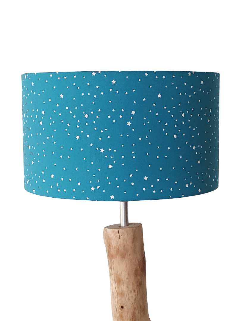 L’abat-jour est réalisé à partir d'une carcasse métallique finition époxy blanche recouverte de tissu 100% coton certifié OEKO TEX (sans produit chimique) motifs imprimés étoiles contrecollé sur un polyphane ignifugé blanc (PVC non inflammable).