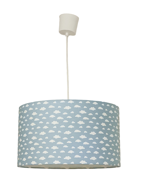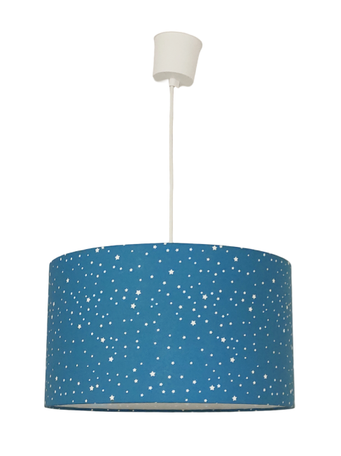 La suspension abat-jour est réalisée à partir d'une carcasse métallique finition époxy blanche recouverte de tissu bleu 100% coton certifié OEKO TEX (sans produit chimique) motifs imprimés étoiles blanches contrecollé sur un polyphane ignifugé blanc (PVC non inflammable).