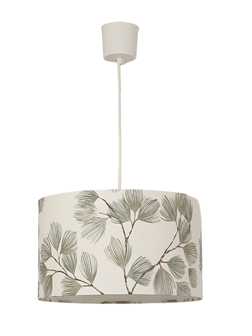 La suspension abat-jour est réalisée à partir d'une carcasse métallique finition époxy blanche recouverte de papier intissé imprimé motifs Branche Feuillage vert et doré contrecollé sur un polyphane ignifugé blanc (PVC non inflammable).