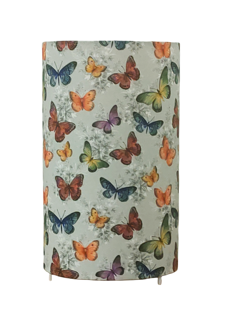 La lampe tube est réalisée à partir d'une carcasse métallique avec pieds finition époxy blanche recouverte de tissu 100% coton certifié OEKO TEX (sans produit chimique) motifs imprimés papillons contrecollé sur un polyphane ignifugé blanc (PVC non inflammable).