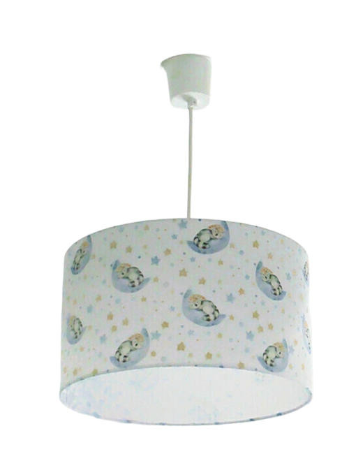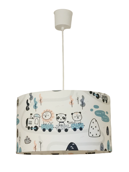 La suspension abat-jour est réalisée à partir d'une carcasse métallique finition époxy blanche recouverte de tissu blanc 100% coton certifié OEKO TEX (sans produit chimique) motifs imprimés animaux fleuris contrecollé sur un polyphane ignifugé blanc (PVC non inflammable).
