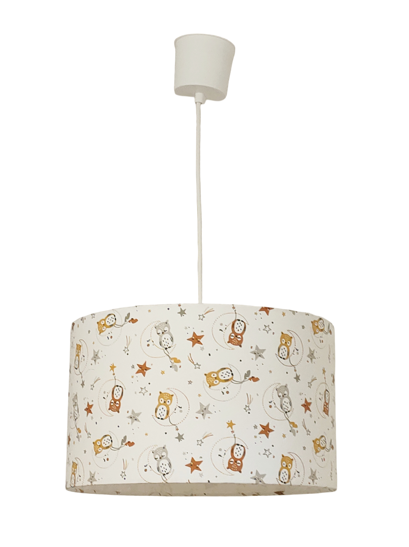 La suspension abat-jour est réalisée à partir d'une carcasse métallique finition époxy blanche recouverte de tissu 100% coton certifié OEKO TEX (sans produit chimique) motifs imprimés petites chouettes ocres et grises contrecollé sur un polyphane ignifugé blanc (PVC non inflammable).