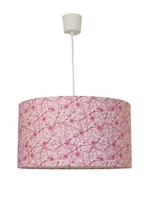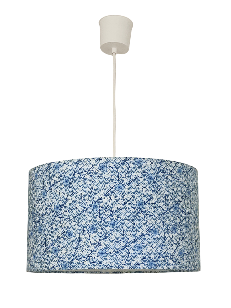 La suspension abat-jour est réalisée à partir d'une carcasse métallique finition époxy blanche recouverte de tissu 100% coton certifié OEKO TEX (sans produit chimique) motifs imprimés japonais vague seigaiha et fleurs de cerisiers contrecollé sur un polyphane ignifugé blanc (PVC non inflammable).