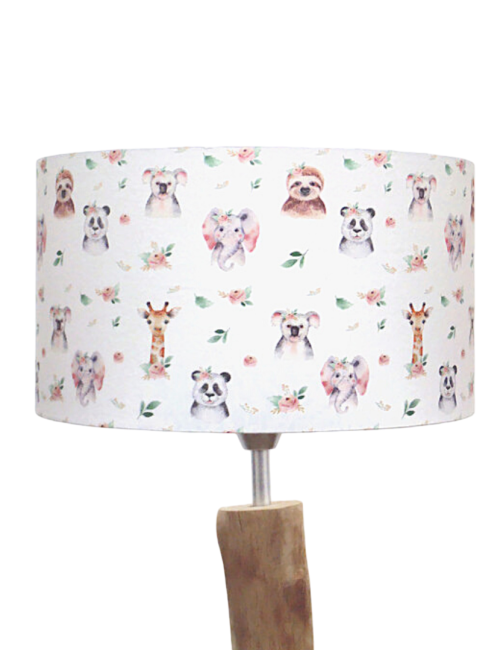 L’abat-jour est réalisé à partir d'une carcasse métallique finition époxy blanche recouverte de tissu 100% coton certifié OEKO TEX (sans produit chimique) motifs imprimés animaux fleuris contrecollé sur un polyphane ignifugé blanc (PVC non inflammable).