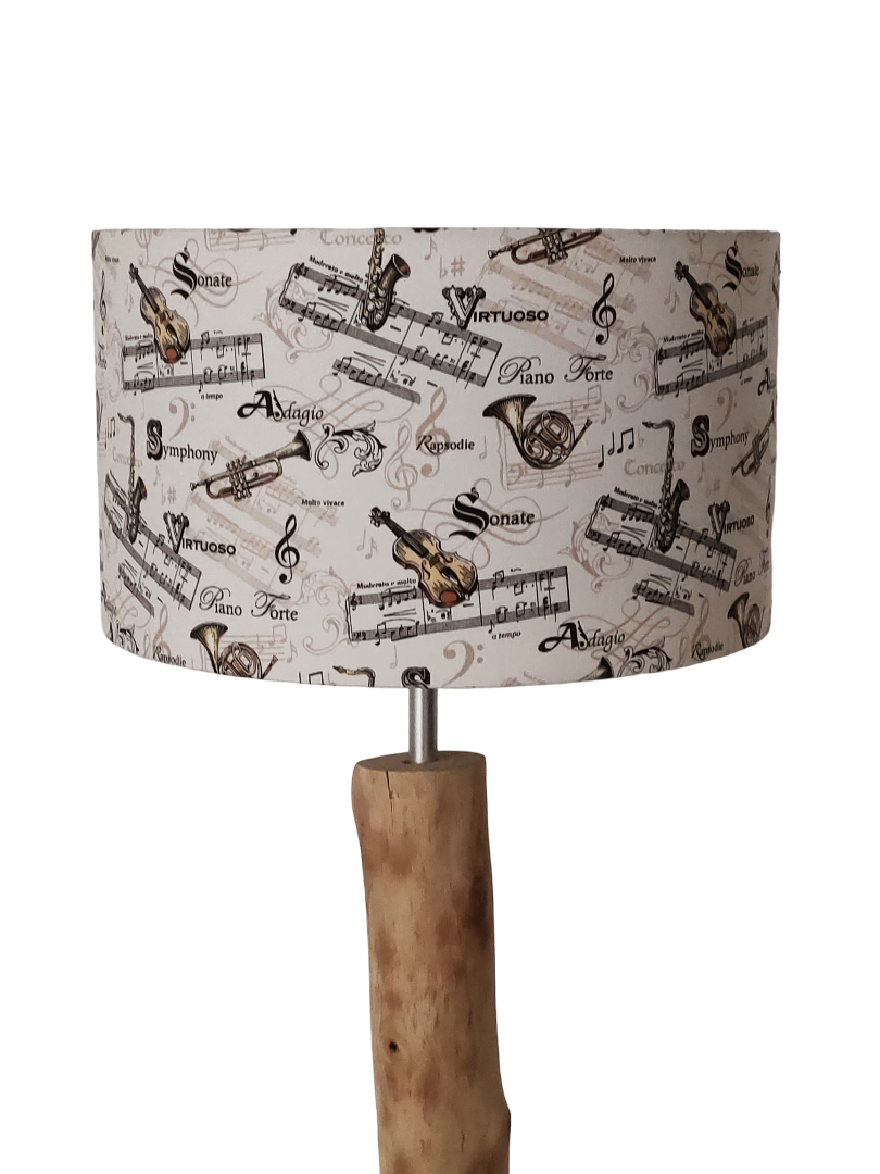 L’abat-jour est réalisé à partir d'une carcasse métallique finition époxy blanche recouverte de tissu 100% coton certifié OEKO TEX (sans produit chimique) motifs imprimés instruments de musique contrecollé sur un polyphane ignifugé blanc (PVC non inflammable).