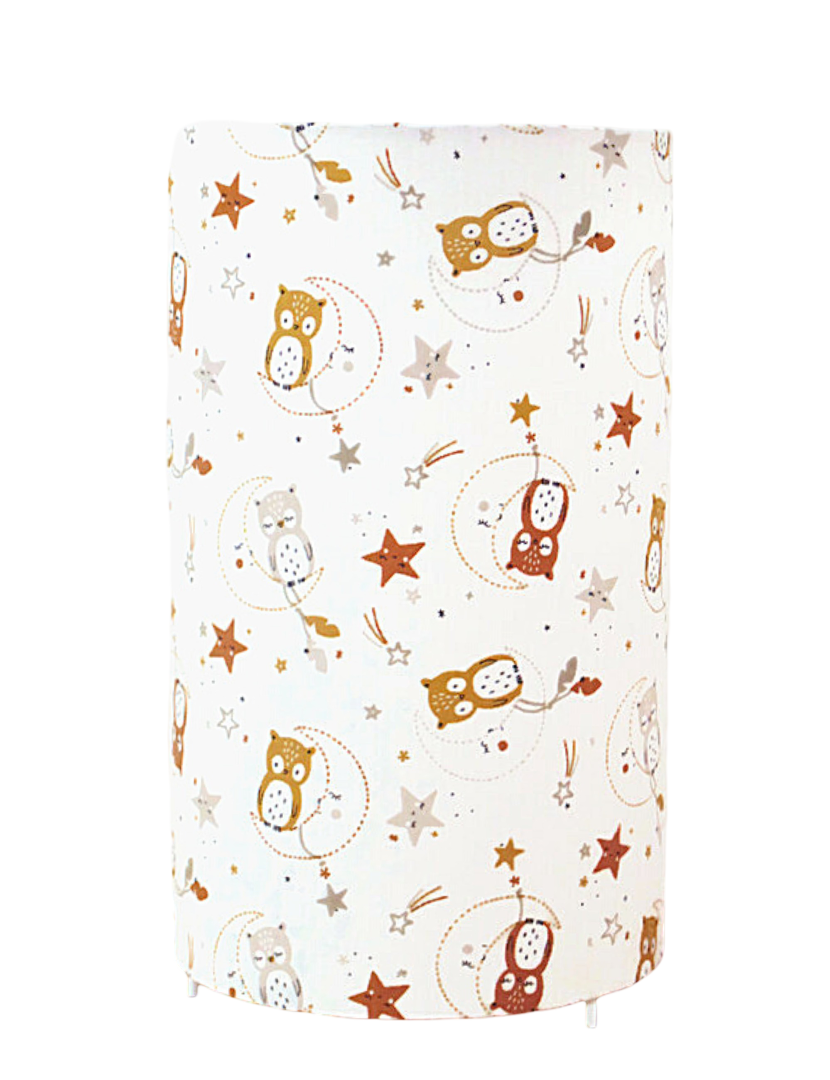 La lampe tube est réalisée à partir d'une carcasse métallique avec pieds finition époxy blanche recouverte de tissu 100% coton certifié OEKO TEX (sans produit chimique) motifs imprimés petites chouettes contrecollé sur un polyphane ignifugé blanc (PVC non inflammable).