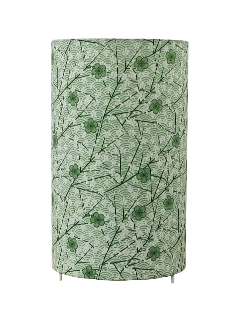 La lampe tube est réalisée à partir d'une carcasse métallique avec pieds finition époxy blanche recouverte de tissu 100% coton certifié OEKO TEX (sans produit chimique) motifs imprimés vague seigaiha et fleurs de cerisiers vert contrecollé sur un polyphane ignifugé blanc (PVC non inflammable).