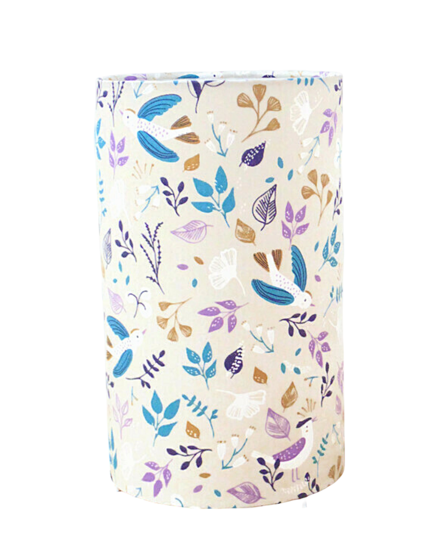 La lampe tube est réalisée à partir d'une carcasse métallique avec pieds finition époxy blanche recouverte de tissu 100% coton certifié OEKO TEX (sans produit chimique) motifs imprimés oiseaux contrecollé sur un polyphane ignifugé blanc (PVC non inflammable).