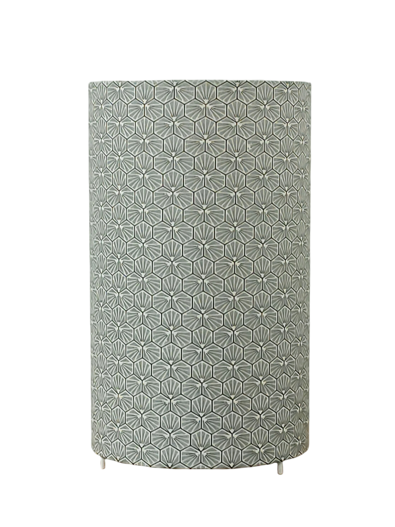 La lampe tube est réalisée à partir d'une carcasse métallique avec pieds finition époxy blanche recouverte de tissu 100% coton certifié OEKO TEX (sans produit chimique) motifs imprimés géométriques - Riad Argent contrecollé sur un polyphane ignifugé blanc (PVC non inflammable).