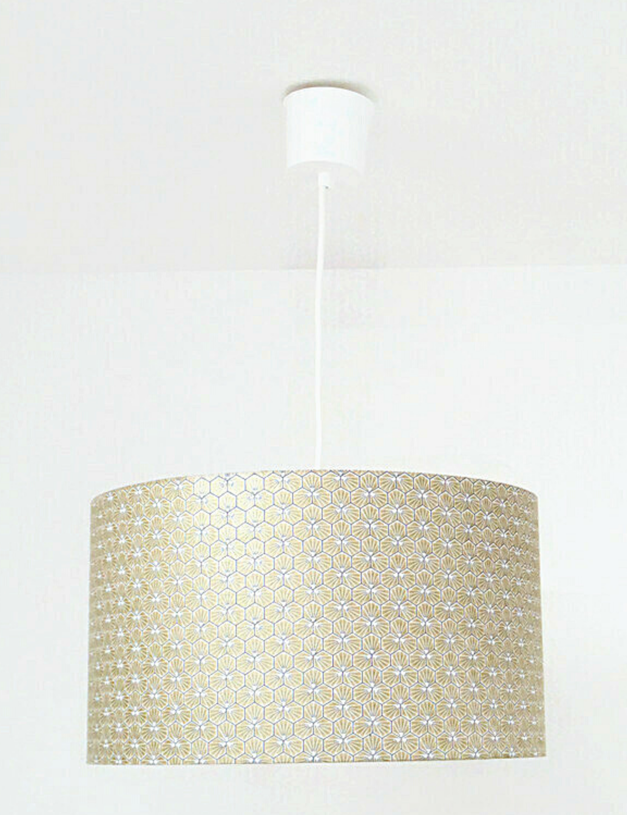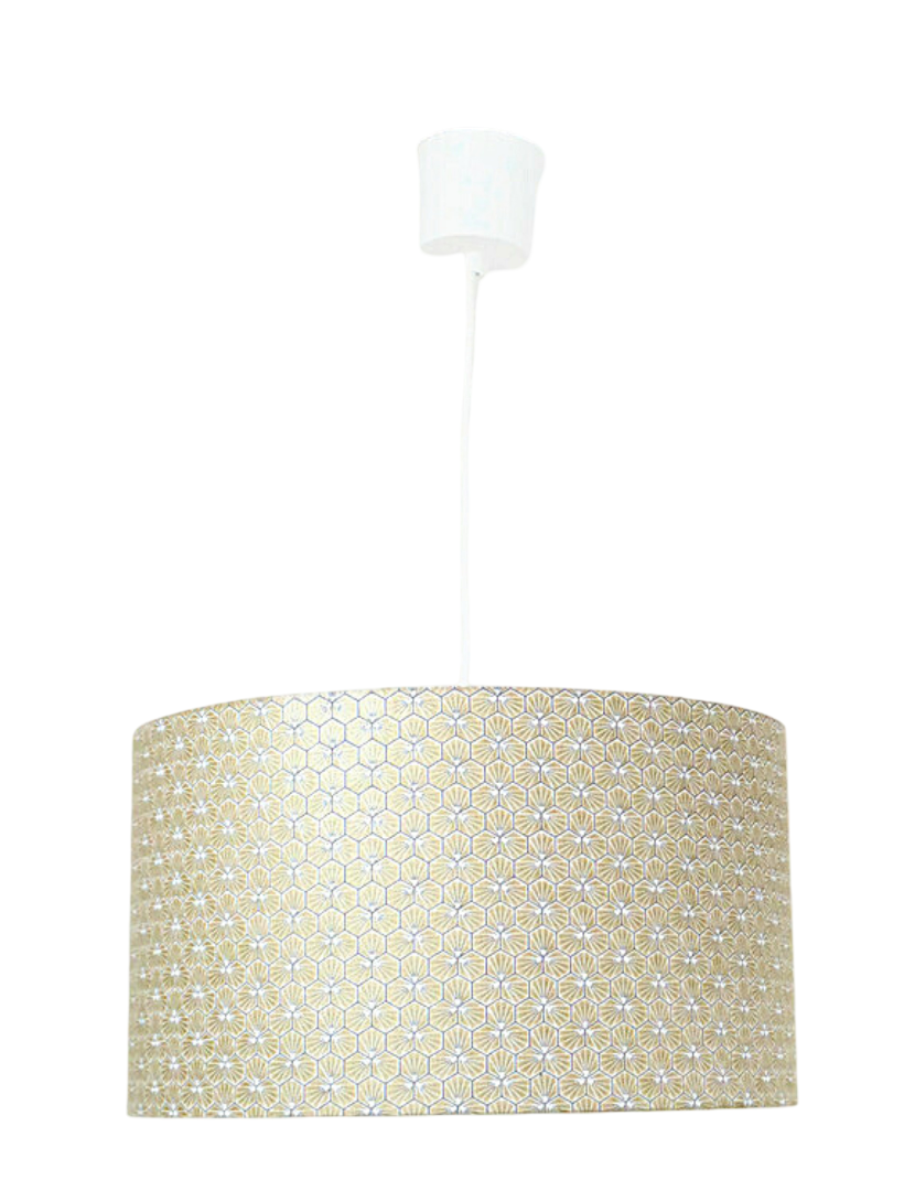 La suspension abat-jour est réalisée à partir d'une carcasse métallique finition époxy blanche recouverte de tissu 100% coton certifié OEKO TEX (sans produit chimique) motifs imprimés géométrique riad or contrecollé sur un polyphane ignifugé blanc (PVC non inflammable).