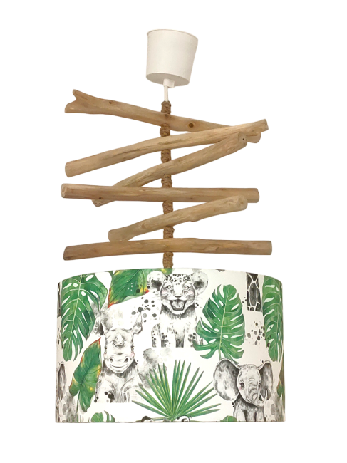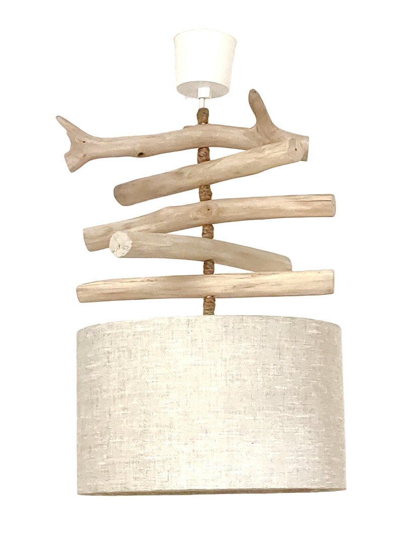 Création Artisanale Française - Lustre en bois flotté avec abat-jour cylindrique.
