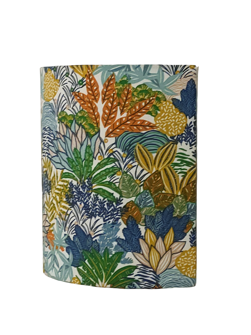 Les Appliques Murales sont réalisées à partir d'une carcasse métallique demi-cylindrique finition peinture époxy blanche recouverte de tissu 100% coton certifié OEKO TEX (sans produit chimique) motifs imprimés feuillage fleuri - Hespérides contrecollé sur un polyphane ignifugé blanc (PVC non inflammable).