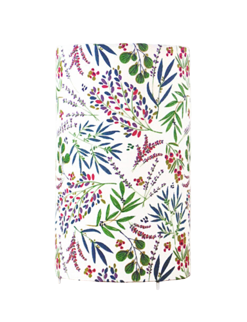 La lampe tube est réalisée à partir d'une carcasse métallique avec pieds finition époxy blanche recouverte de tissu 100% coton certifié OEKO TEX (sans produit chimique) motifs imprimés feuillage fleuri contrecollé sur un polyphane ignifugé blanc (PVC non inflammable).