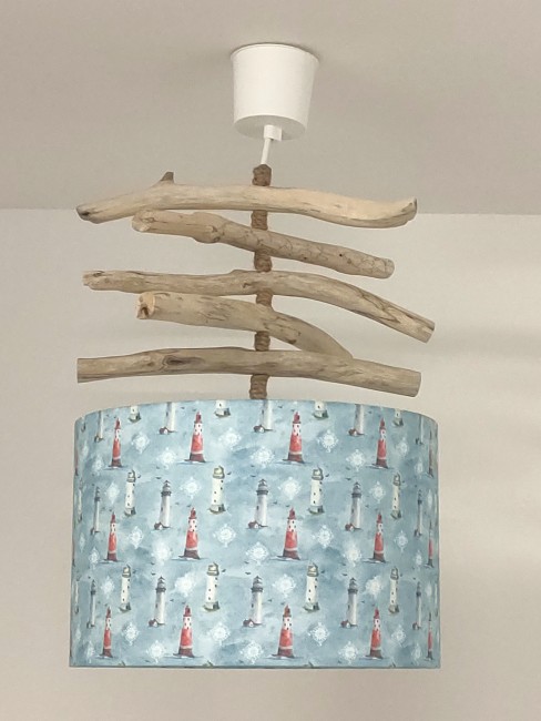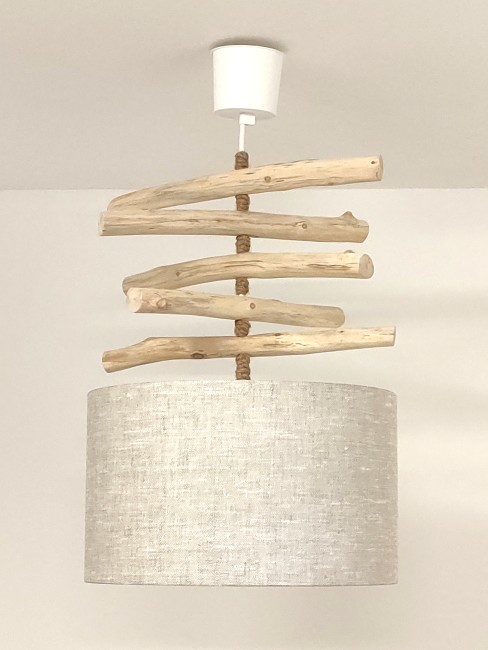 Création Artisanale Française - Lustre en bois flotté avec abat-jour cylindrique.