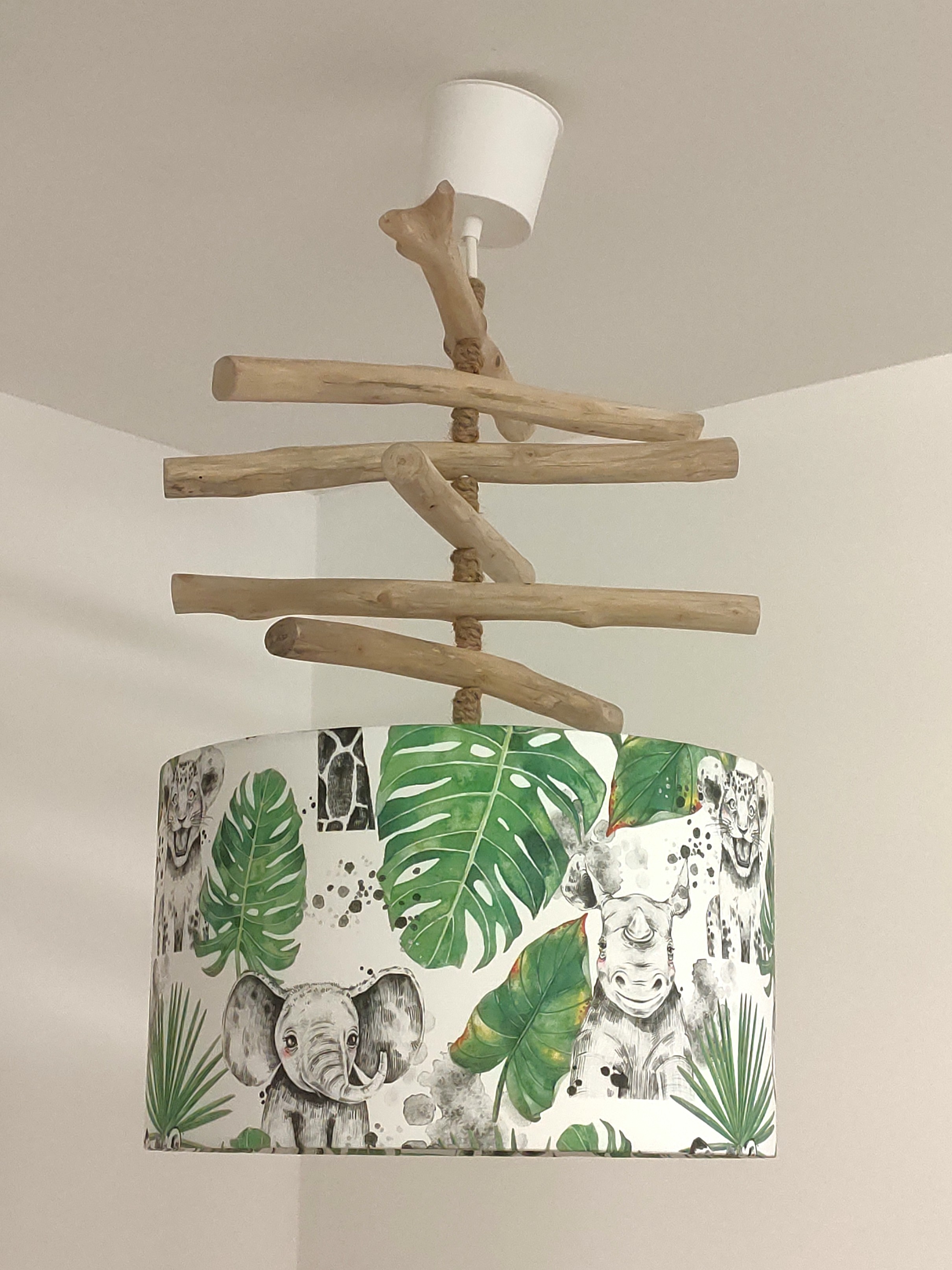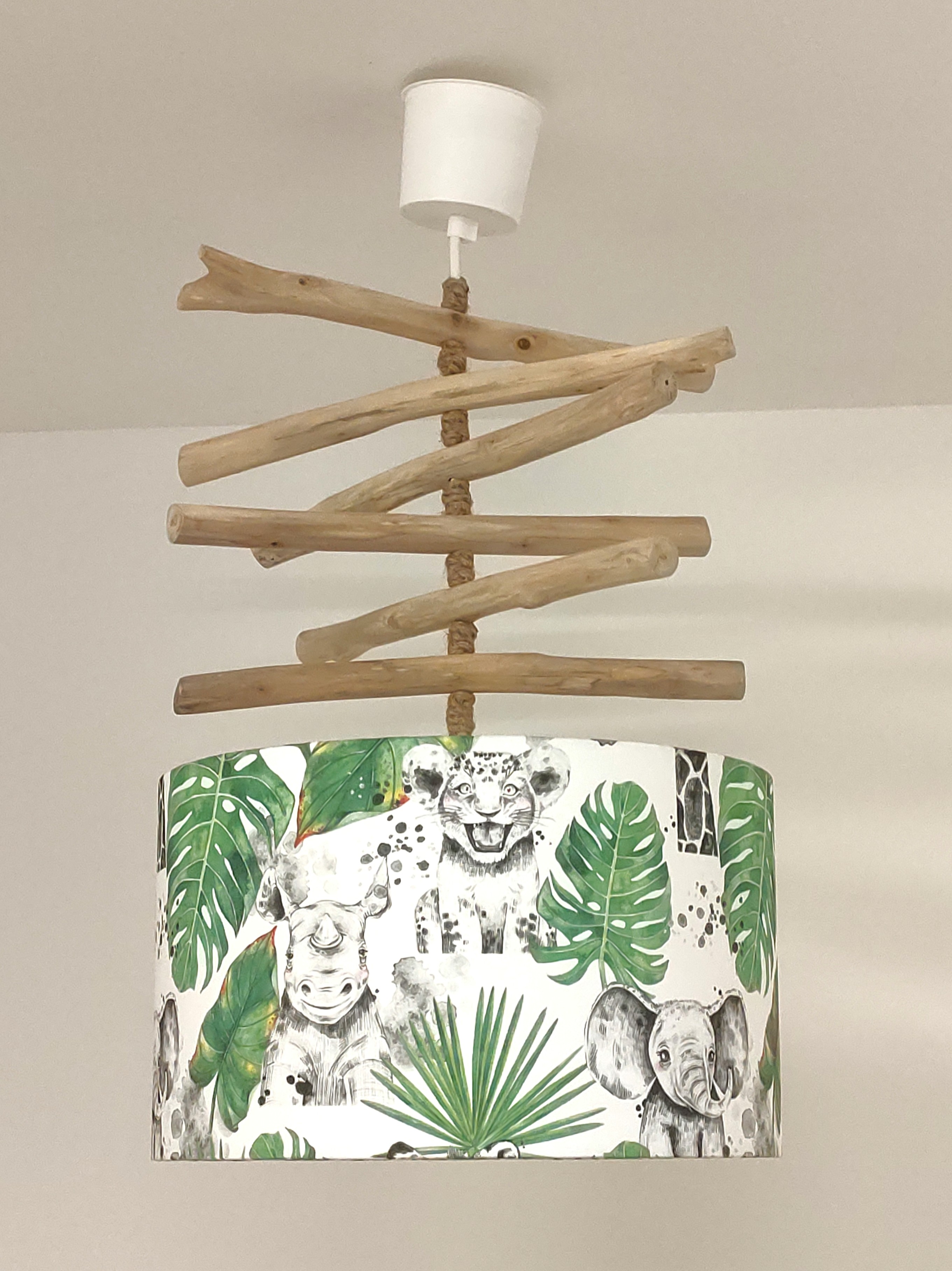 La carcasse de l'abat-jour est en métal finition époxy recouverte de tissu 100% coton certifié OEKO TEX (sans produit chimique) motifs imprimés Animaux de la jungle ( tigre - girafe - rhinocéros - éléphant) contrecollé sur un polyphane ignifugé blanc (PVC non inflammable).