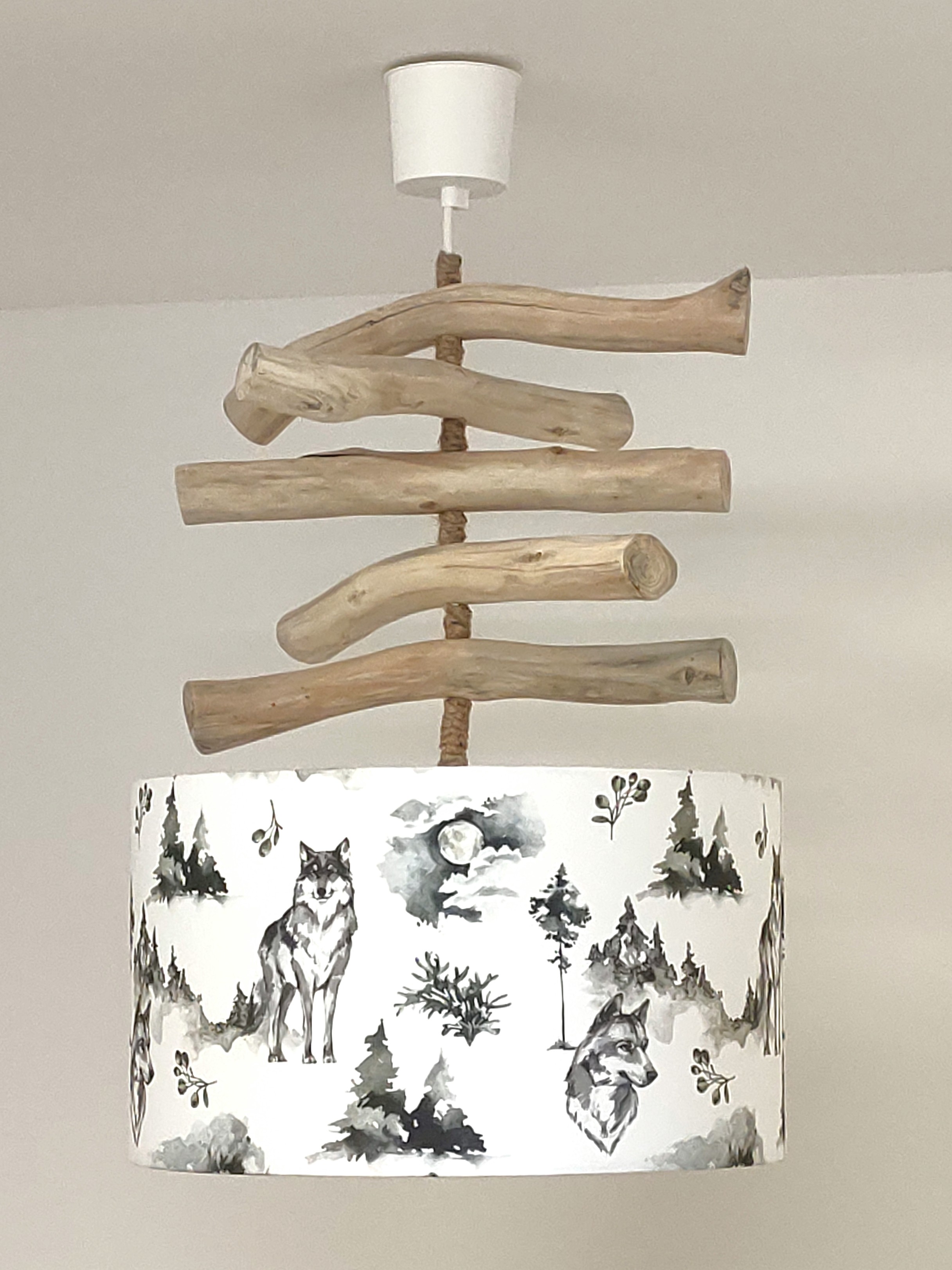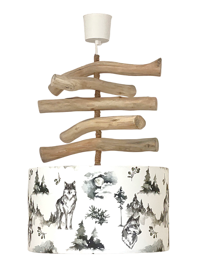 La carcasse de l'abat-jour est en métal finition époxy recouverte de tissu 100% coton certifié OEKO TEX (sans produit chimique) motifs imprimés Les loups contrecollé sur un polyphane ignifugé blanc (PVC non inflammable).
