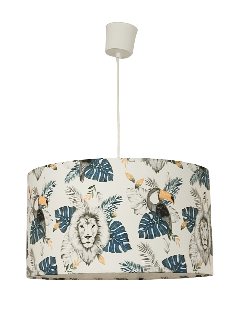 La suspension abat-jour est réalisée à partir d'une carcasse métallique finition époxy blanche recouverte de tissu 100% coton certifié OEKO TEX (sans produit chimique) motifs imprimés Animaux de la jungle ( lion - toucan et feuilles exotiques déco tropicale) contrecollé sur un polyphane ignifugé blanc (PVC non inflammable).