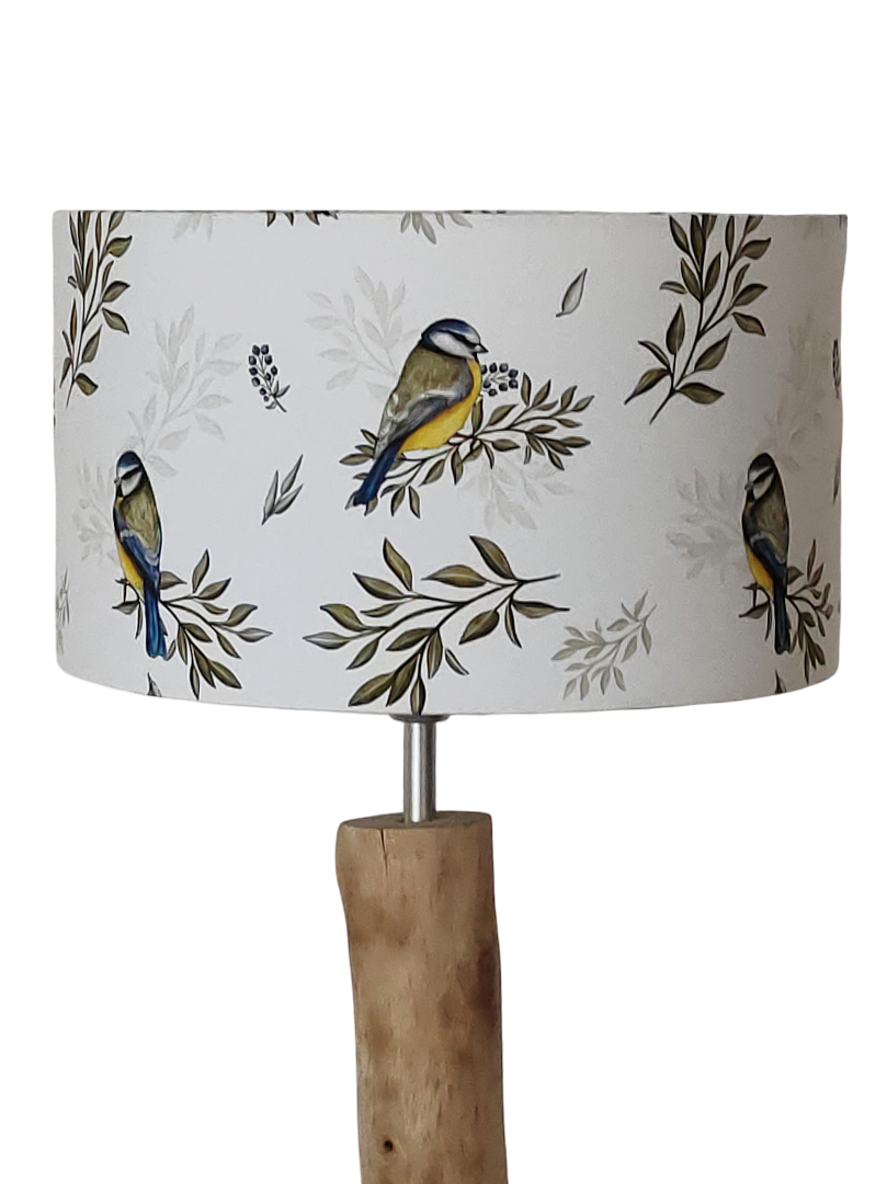 L’abat-jour est réalisé à partir d'une carcasse métallique finition époxy blanche recouverte de tissu 100% coton certifié OEKO TEX (sans produit chimique) motifs imprimés oiseaux - mésanges contrecollé sur un polyphane ignifugé blanc (PVC non inflammable).