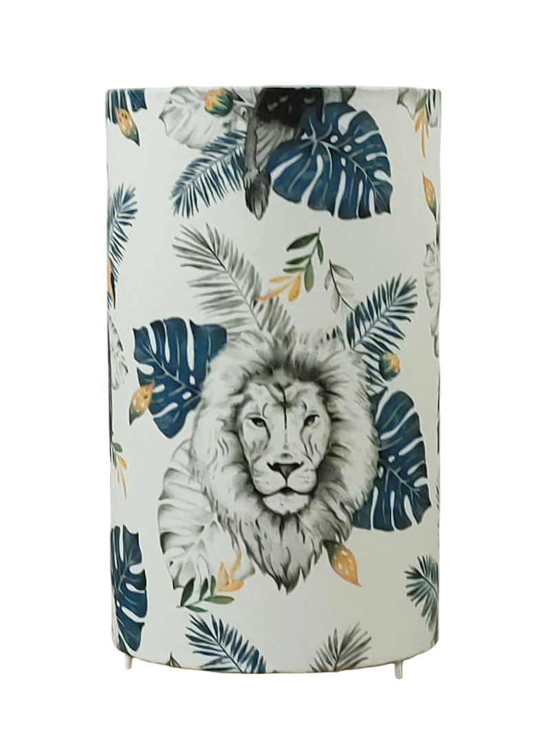 La lampe tube est réalisée à partir d'une carcasse métallique avec pieds finition époxy blanche recouverte de tissu 100% coton certifié OEKO TEX (sans produit chimique) motifs imprimés Animaux de la jungle ( lion - toucan et feuilles exotiques déco tropicale) contrecollé sur un polyphane ignifugé blanc (PVC non inflammable).