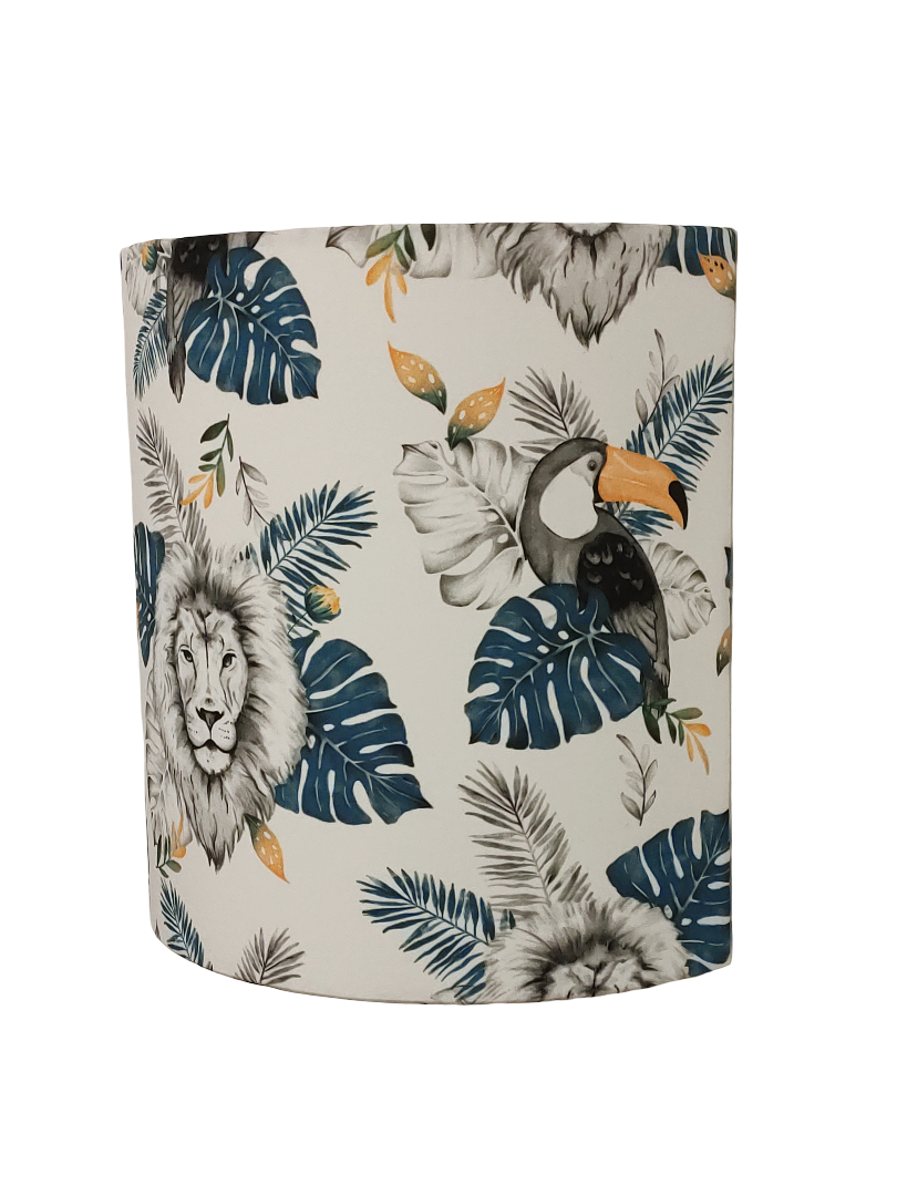 Les Appliques Murales sont réalisées à partir d'une carcasse métallique demi-cylindrique finition peinture époxy blanche recouverte de tissu 100% coton certifié OEKO TEX (sans produit chimique) motifs imprimés Animaux de la jungle ( lion - toucan et feuilles exotiques déco tropicale) contrecollé sur un polyphane ignifugé blanc (PVC non inflammable).